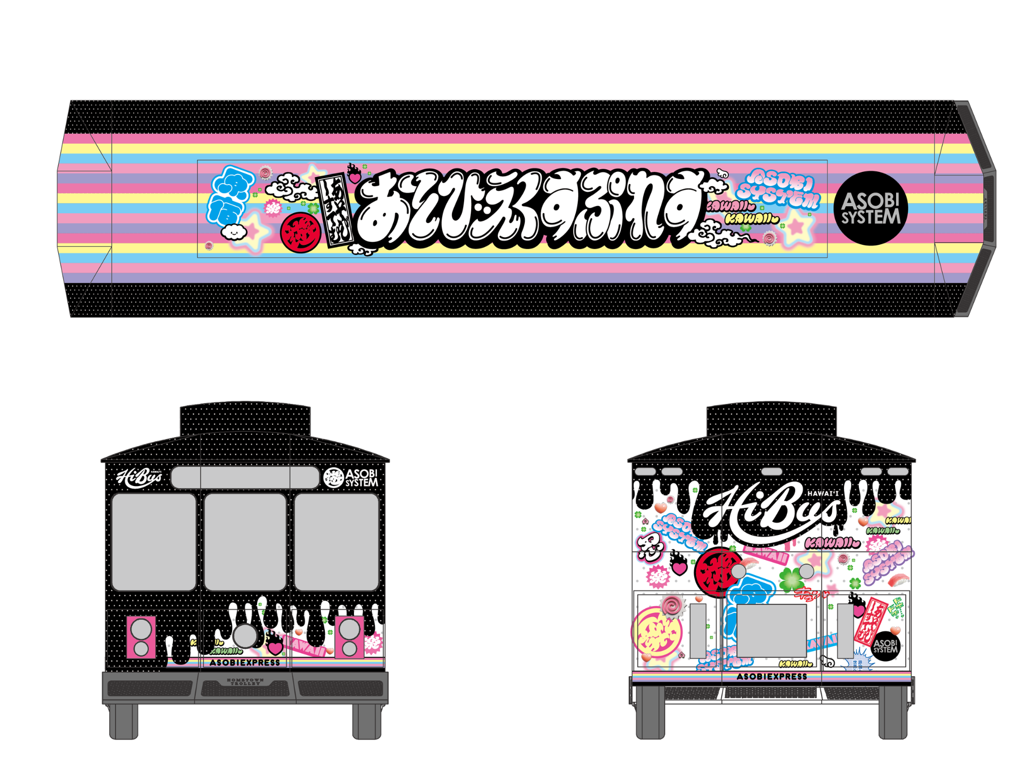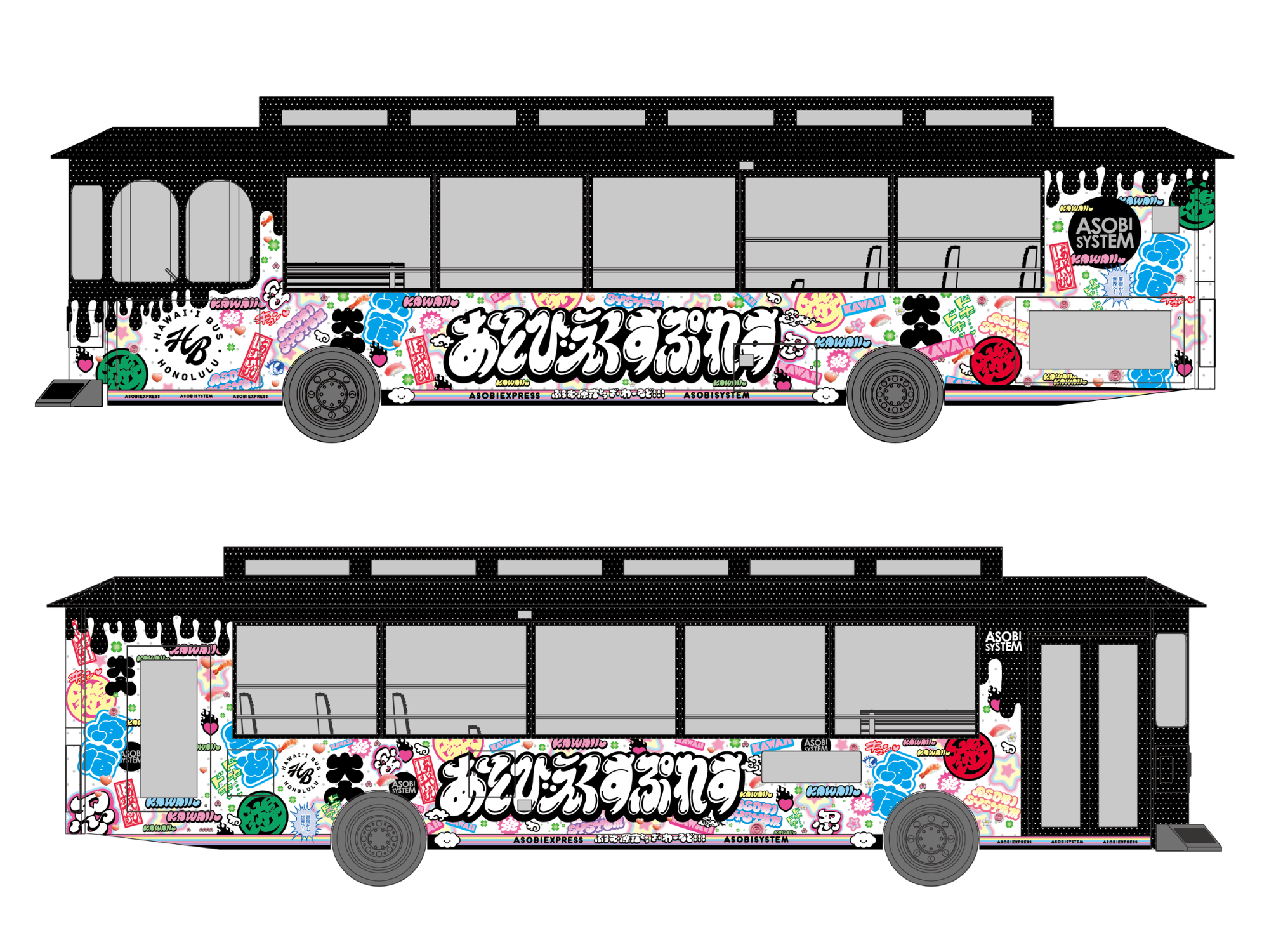 The ASOBIEXPRESS is a uniquely designed bus wrap created as a symbol of connection between Hawaii and Japan through J-POP culture. The wrap design was developed by ASOBISYSTEM, a creative production company that promotes MADE IN JAPAN content to the world.